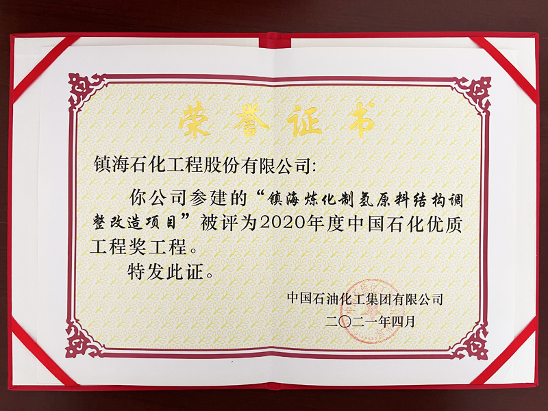 由公司参建的“镇海炼化制氢原料结构调整改造项目”荣获2020年度中石化优质工程奖