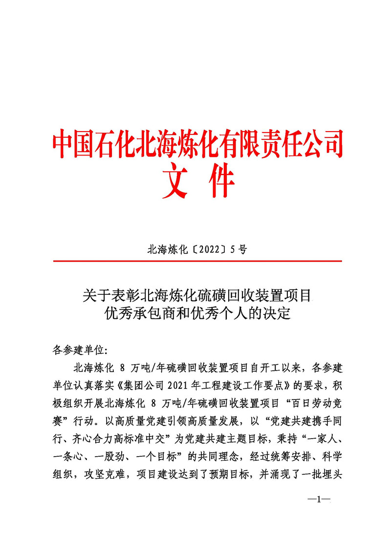 公司荣获中石化北海炼化硫磺回收装置项目“优秀承包商”荣誉称号 谢开波荣获“项目管理先进个人”荣誉称号